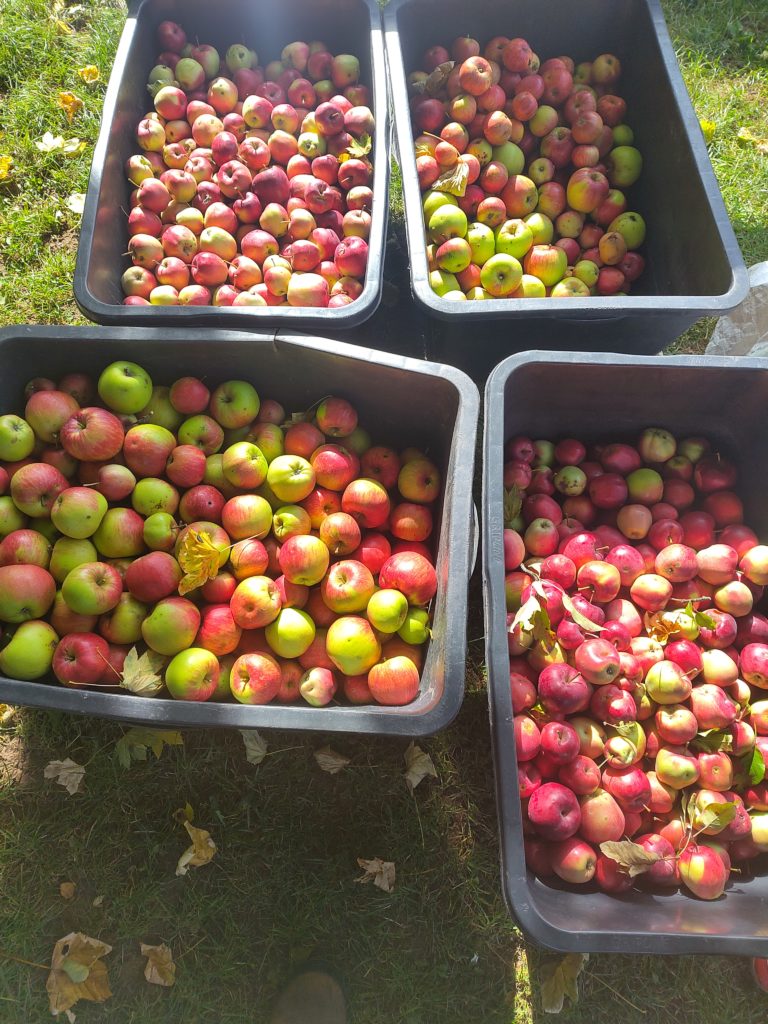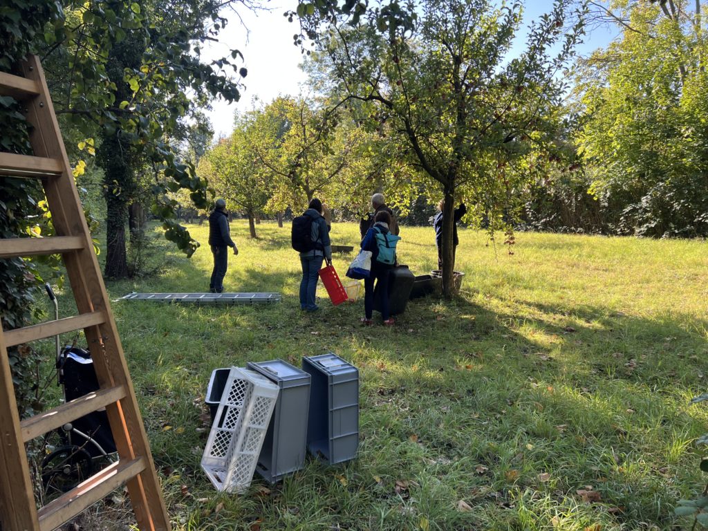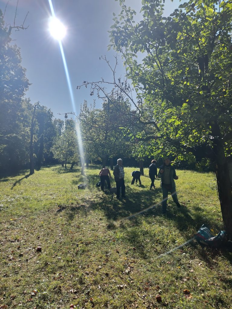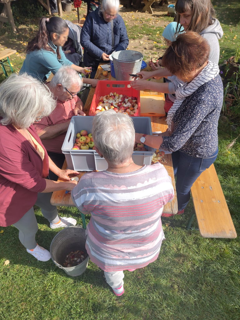 Ein besonderes Highlight war in diesem Jahr unsere Saftpressaktion. Die Ernte fiel erfreulicherweise sehr reich aus. Dank Frank Ringling, der in Zusammenarbeit mit dem Naturschutzverein Grüne Liga Dresden e.V. Streuobstwiesen mithilfe von Schafherden pflegt, konnten wir am 30. September gemeinsam mit Senior*innen des Nachbarschaftsprojekts 60plus aus Pieschen Äpfel auf einer nahegelegenen Streuobstwiese pflücken.
