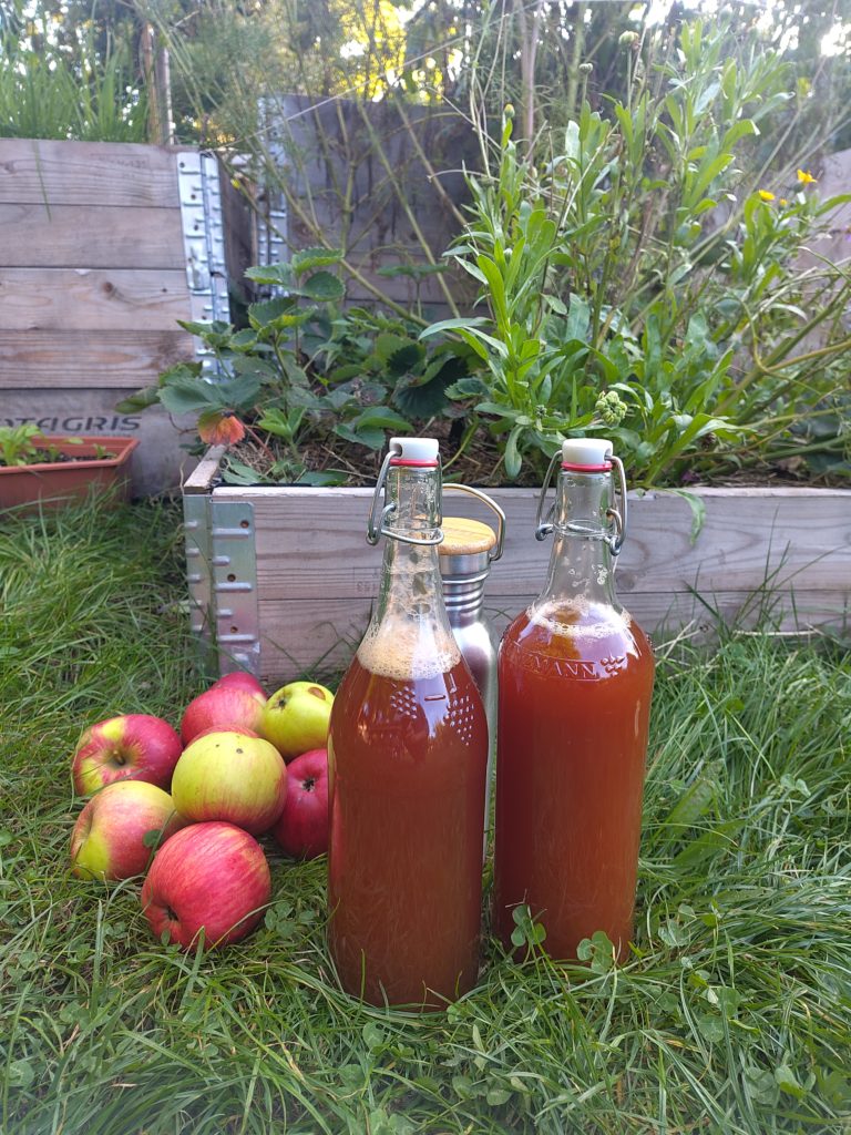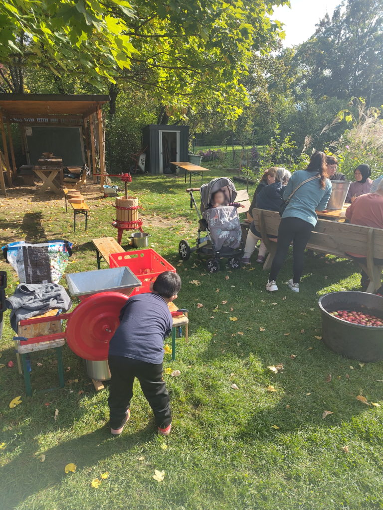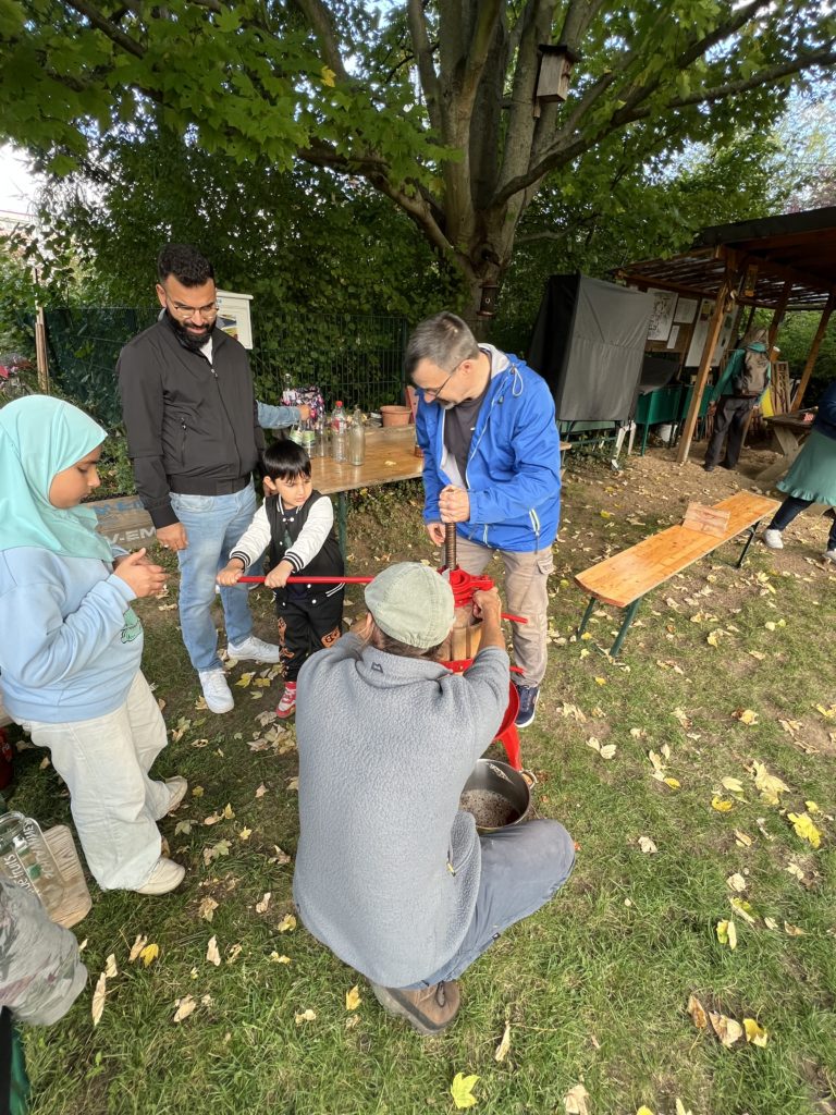 In kurzer Zeit sammelten wir eine große Menge Obst. Am Nachmittag begann dann das eigentliche Saftpressen: Gemeinsam mit Gartenmitgliedern, Kindern, Interessierten aus Prohlis und Teilnehmer*innen des Nachbarschaftsprojekts wurden die Äpfel zerkleinert, zu Maische verarbeitet, gepresst und in selbst mitgebrachte Flaschen abgefüllt. Zusätzlich kochten wir Apfelmus ein – und natürlich durfte zwischendurch immer wieder der frisch gepresste Saft probiert werden.
