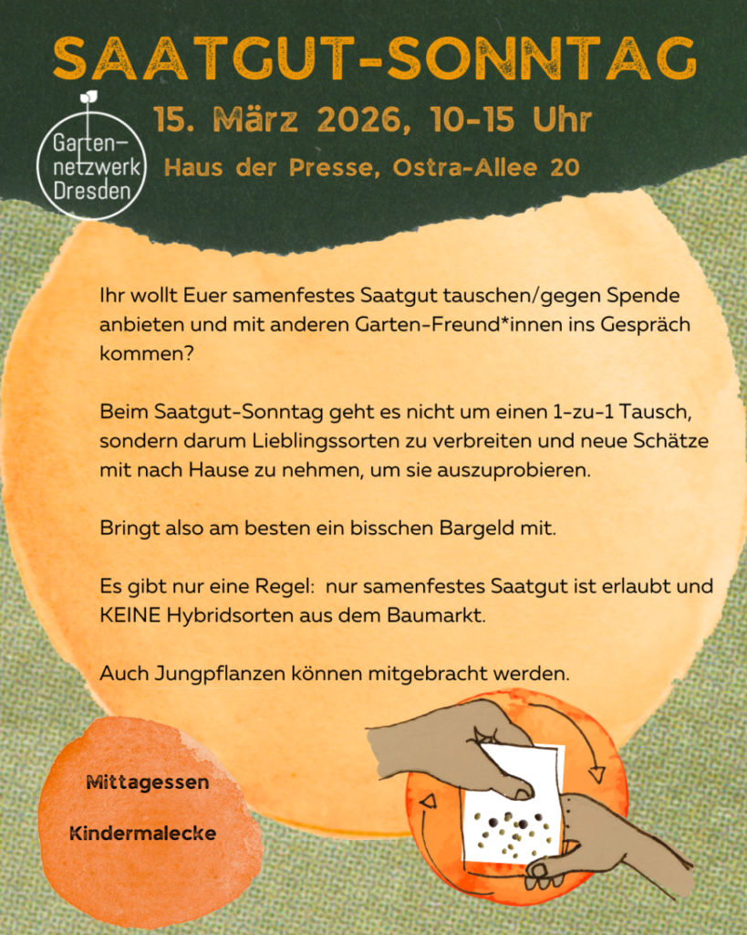 Der SAATGUT-SONNTAG und findet am 15. März 2026 von 10-15 Uhr im Haus der Presse (Foyer), Ostra-Allee 20 statt.