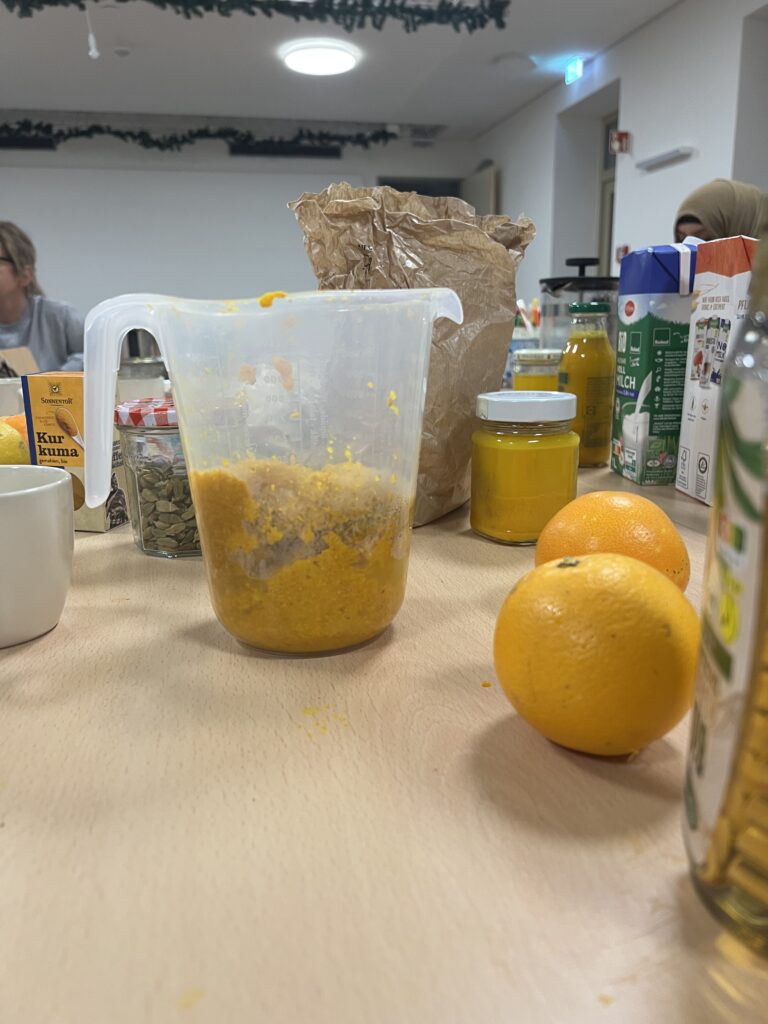 Den Auftakt machten wir am 6. Januar mit einem gesunden Start ins neue Jahr. Aus frischen Zutaten stellten wir Ingwer-Kurkuma-Shots her und wärmten uns mit aromatischem Ingwertee. Ein wohltuender Beginn, der das Immunsystem stärkte und zugleich Anlass bot, miteinander ins Gespräch zu kommen und sich auszutauschen.