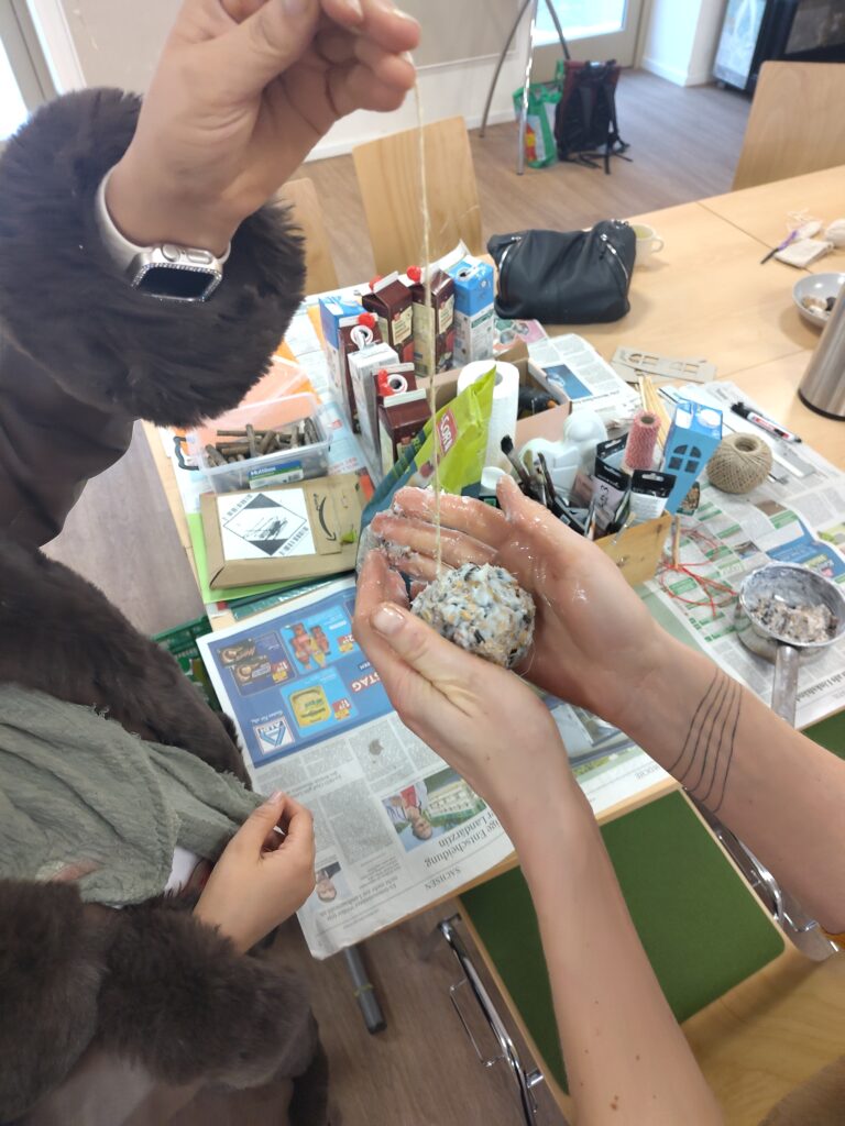 In der darauffolgenden Woche wurde es kreativ: Trotz eisiger Temperaturen und vereister Fußwege, die den Weg zum Bürgerhaus erschwerten, trafen wir uns, um Futterhäuschen aus recycelten Materialien zu basteln und Meisenknödel herzustellen. Die Futterknödel wurden anschließend im Gemeinschaftsgarten Prohlis aufgehängt – als zusätzliche Futterquelle für unsere Wintervögel bei frostigem Wetter.