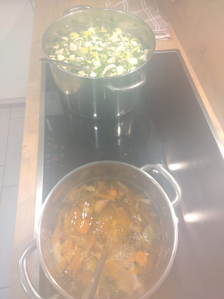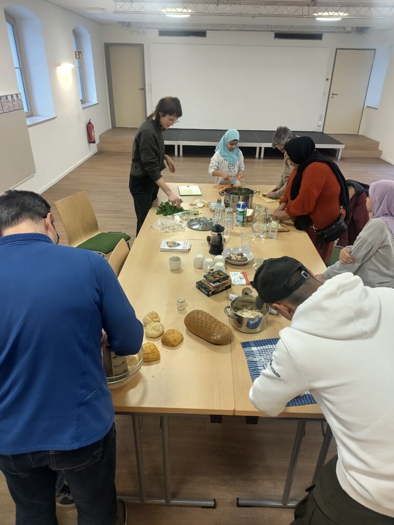 Beim letzten Workshop im Januar widmeten wir uns dem Thema Resteverwertung. Aus Gemüseresten stellten wir unsere eigene Brühe her, und aus altem Brot, das wir dankenswerterweise von der Vortagsbäckerei & Kulturcafé „Tag2wo“ (Instagram: https://www.instagram.com/tag2wo/) gespendet bekommen hatten, bereiteten wir Knödel zu. Am Ende stand ein deftiger Gemüseeintopf mit Knödeln auf dem Tisch, der allen Teilnehmenden hervorragend schmeckte und zeigte, wie kreativ, einfach und nachhaltig Kochen sein kann.
