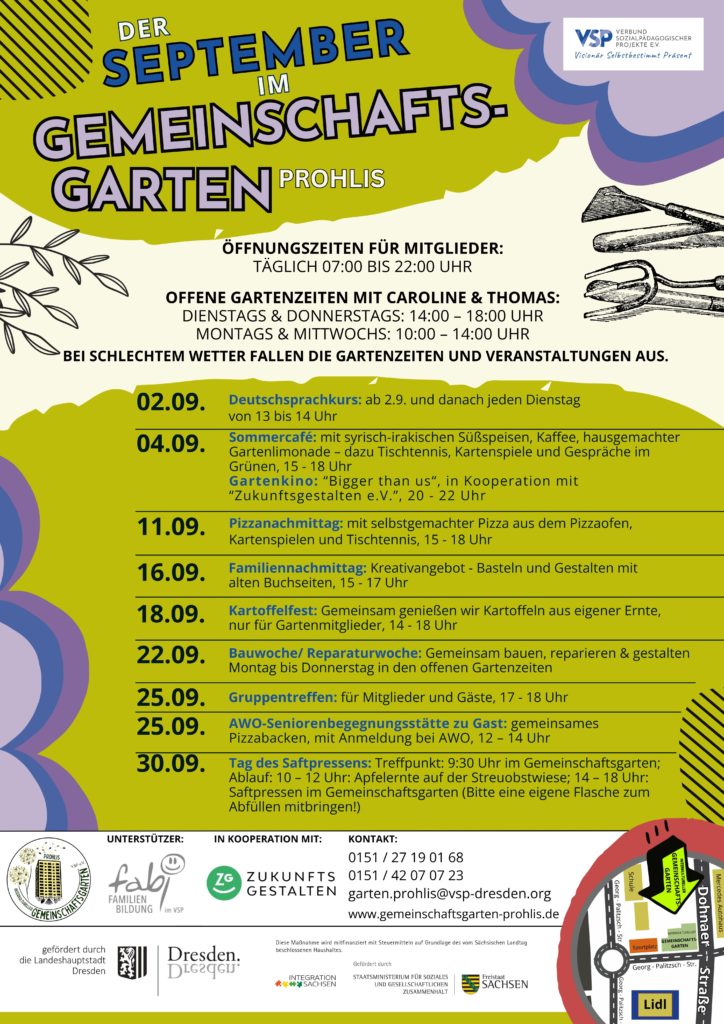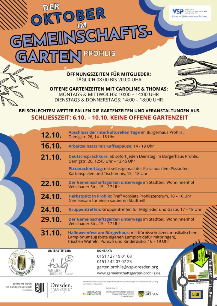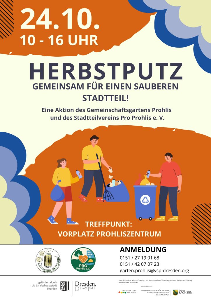 24.10. Herbstputz 25. September 202525. September 2025 von , posted in Termine Sei dabei und engagiere dich für einen sauberen Stadtteil!Melde dich bei uns unter den untenstehenden Kontaktdaten an. Eine Aktion des Gemeinschaftsgartens Prohlis und des Stadtteilvereins Pro Prohlis e. V.